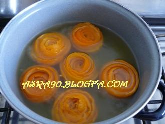 طرز تهیه:پرتقال رو مثل سیب پوست بکنین،مراقب باشین که پاره نشه. من قسمت های سفیدش هم خیلی نمیگیرم.اون رو به شکل گل بپیچین و با یه خلال دندون محکم کنین.داخل یه قابلمه آب سرد بریزین و گلهای رز پرتقایتون رو توش بذارین.روی حرارت ملایم قرار بدین تا وقتی به جوش بیاد وقتی چند جوش زد آبش رو خالی کنین و این بار آب ولرم روش بریزین و باز بذارین بجوشه.معمولا سه بار جوشوندن کافیه.اگه بیشتر این کارو تکرار کنین پرتقالها عطرشون رواز دست میدن.البته تست کنین که پوست پرتقالها خوب پخته باش و نرم بشن،چون وقتی شکر رو اضافه میکنیم و شیره قوام میاد پوست پرتقالها کمی سفت میشن.پرتقالها رو توی صافی بریزین توی قابلمه شکر و دو لیوان آب بریزین و گلهای پرتقالیتون رو توی اون بذارین و بجوشونین تا مربا قوام بیاد در آخر آبلیمو رو اضافه کنین و بعد از چند تا جوش مربا آماده ست.