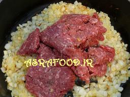 در این فاصله پیاز را خرد کنید.در روغن پیاز رو تفت بدید.اگه از سیر استفاده میکنید تو این مرحله سیر رو له کنید و به پیاز اضافه کنید. گوشت رو به پیاز اضافه کنید و تفت بدید.