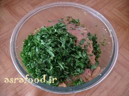 سبزی رو که خرد کنید و بگذارید تا کاملا آبش گرفته بشه. (میتونید از قبل سبزی را آماده کنید و بگذارید تا به صورت نیمه خشک در بیاد.)