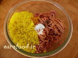 برنج رو با کمی زردچوبه و بدون روغن کته کنید و اون رو به گوشت اضافه کنید، برنج نباید میکس بشه. نمک و ادویه ها رو اضافه کنید.