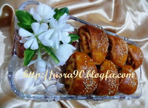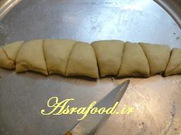 توی سینی فر بچینید.20 دقیقه به خمیر استراحت بدید.و زرده تخم مرغ و زعفران و یک قاشق روغن مایع رو مخلوط کنید و روی خمیر بمالید.و روش کنجد بپاشید.