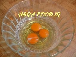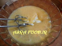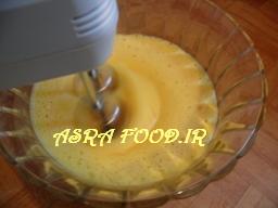 تخم مرغها و وانیل رو با هم زن بزنید تا کف کنه و حجمش دو برابر بشه.