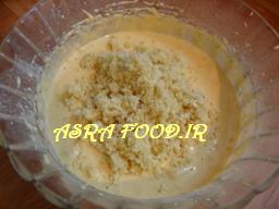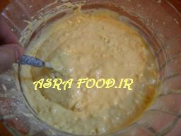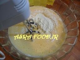 آرد رو که بهتره الک کرده باشید با بکینگ پودر مخلوط کنید وتوی مواد بریزید و با هم زن بزنید تا با مواد مخلوط بشه.