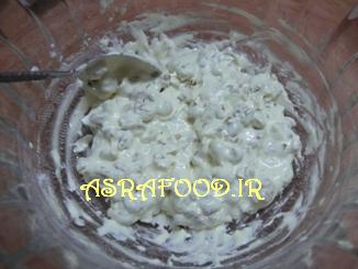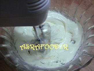 زرده تخم مرغ رو و وانیل رو با هم زن بزنید تا رنگش روشن بشه(حدود یک دقیقه