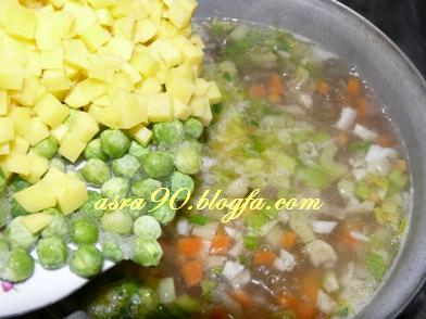 سیب زمینی رو هم حبه قندی خرد کنید و با نخود فرنگی به سوپ اضافه کنید.
