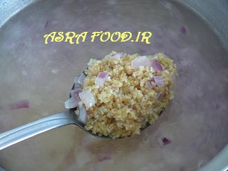 وقتی بلغور پخت و لعاب انداخت نخود پخته شده رو بریزید. دیگه مامان صبر نکرده بود من عکس بگیریم. اگه نخود رو از شب قبل خیس کنید و بلغور رو هم چند ساعت، بعد از اینکه پیاز رو تفت دادید بلغور و نخود رو با هم بریزید و بگذارید پخته بشه.