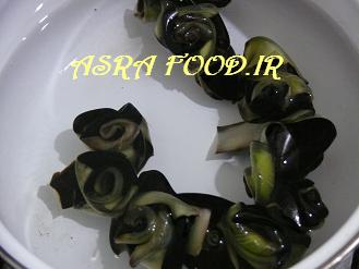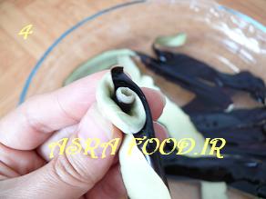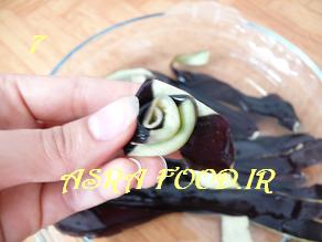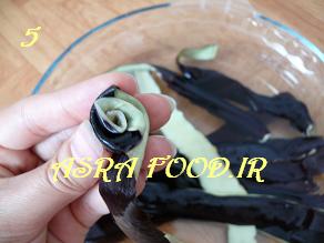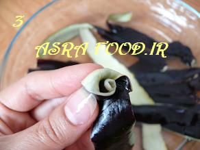 پوست بادمجانها رو مثل گلهای رزی که با روبان درست میشه می پیچیم، عکس مراحلش رو گرفتم امیدوارم با عکس متوجه بشید.