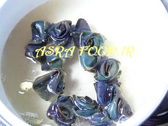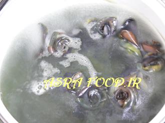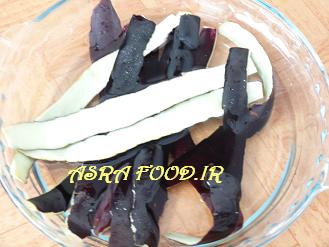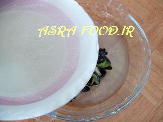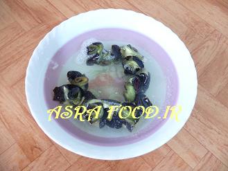 بادمجانها باید چهارساعت داخل آب معمولی بمونند در این مدت دو تا سه بار آب رو عوض میکنیم.