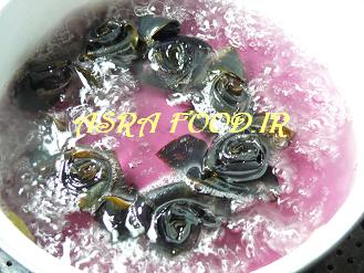 گلها رو داخل شربت میندازیم و 25 تا 30 دقیقه میجوشونیم تا پخته و شربت قوام بیاد.