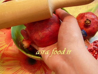 میتونید بشینید و با حوصله دونه دونه ، دونه های انار رو خالی کنید اما یک روش تنبلانه هست که شمالی های عزیز هم وقتی میخوان رب انار درست کنند از این روش استفاده میکنند. وسیله لازم یک تیکه چوب یا وردنه استفاده کنید. همونطور که تو عکس میبینید نصف انار رو برعکس توی دستتون بگیرید و زیر دستتون یه ظرف بگیرید و با وردنه به پشت انار بیجاره بزنید، دونه های انار میریزه تو ظرف.