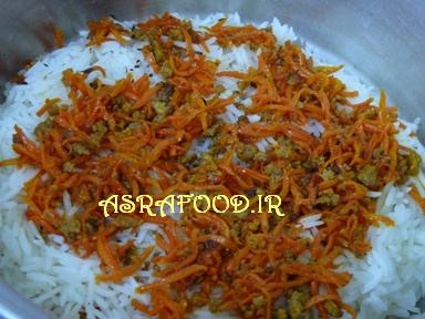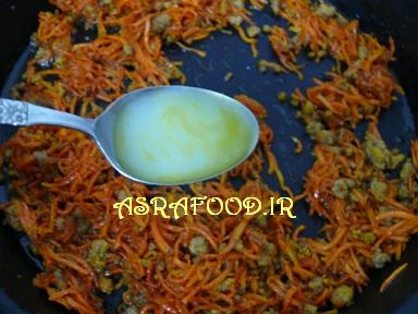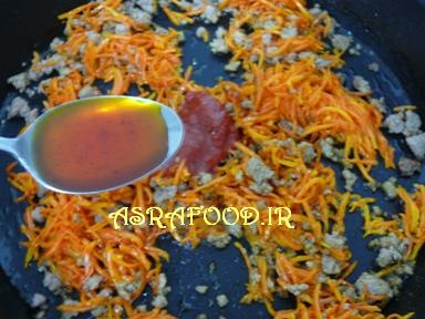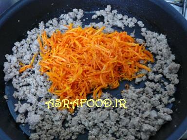 وقتی آب گوشت کشیده شد، هویج سرخ شده رو داخل گوشت بریزید و کمی تفت بدید.