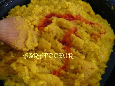 مرتب حلوا رو هم بزنید تا شربت جذب حلوا بشه. من چون دیدم رنگ حلوام روشن شده باز هم کمی زعفران اضافه کردم.