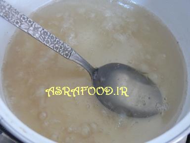 شکر و آب و گلاب رو مخلوط کنید و بگذارید رو شعله و مدام هم بزنید تا شکر حل بشه یکی دو جوش که زد شعله رو خاموش کنید.
