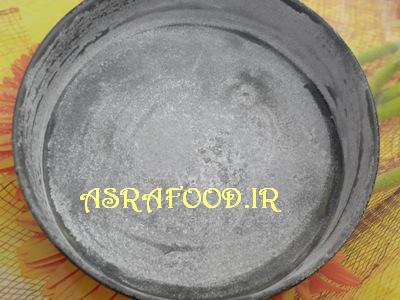 پس قالب رو چرب میکنیم و روش آرد میپاشیم و خوب تو دست تکون میدیم تا همه جای قالب آردی بشه بعد قالب رو برمیگردونیم و با دست به پشت قالب میزنیم تا اضافه های آرد خارج بشه.