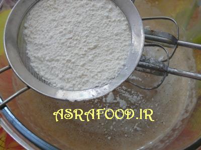 بکینگ پودر رو با آرد مخلوط کنید و روی کیک الک کنید. و چند دور با هم زن بزنید تا مخلوط بشه.