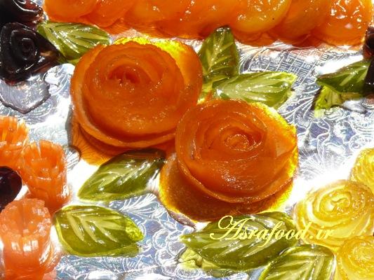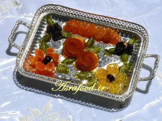 مثلا 5 تا مربای انجیر یا مربای زردآلو یا زرد آلوی آفتابی رو کنار هم بچینید تا به شکل گل بشه. مربای کامکوات هم برای سینی مربا خیلی عالیه.