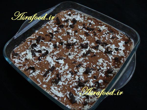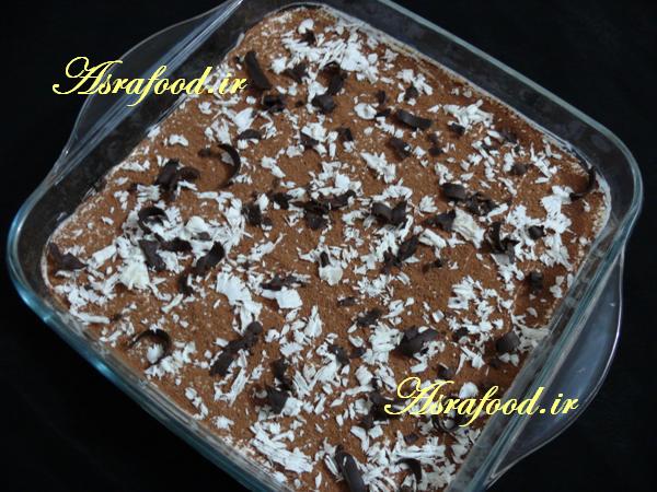 زمان سرو روی دسر رو شکلات رنده میکنیم من از دو نوع شکلات سیاه و سفید استفاده کردم.