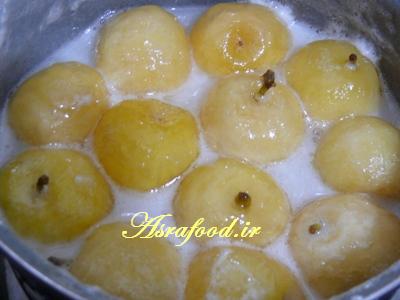 آب سیبها رو خالی میکنیم و سیبها رو داخل شیره می ریزیم و با شعله کم میگذاریم سیبها پخته و شیره قوام بیاد. جدود نیم ساعت تا 45 دقیقه بسته به شعله طول میکشه تا مربا قوام بیاد. در این حین کف روش رو هم تا حد امکان بگیرید.
