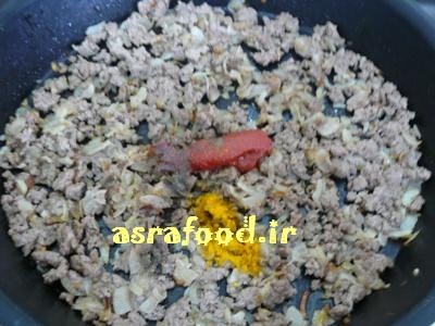 پیاز رو تفت بدید بعد گوشت رو اضافه کنید و رب و ادویه و نمک بزنید. کمی آب بریزید و بگذارید گوشت جا بیفته.