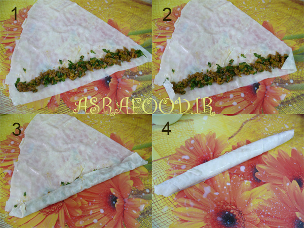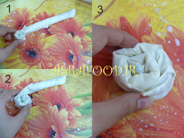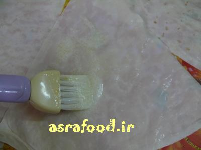 گوشه های خمیر رو روی مایع بیارید، و خمیر رو بپیچید تا بشکل لوله بشه.