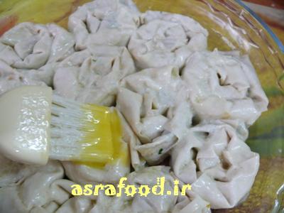 از مخلوط تخم مرغ و روغن و ماست روی خمیرها بمالید. فقط دقت کنید خیلی زیاد نشه.