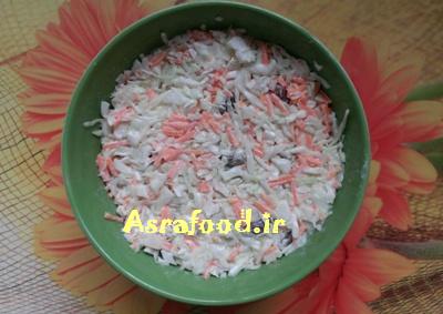 هویج رو رنده ریز کنید.این رو هم میتونید تو غذاساز خرد کنید، البته کلم و هویج رو باهم داخل غذاساز نریزید چون رنگ سالاد نارنجی میشه.