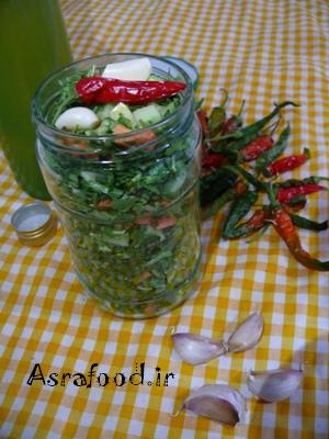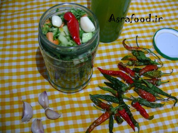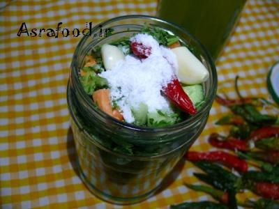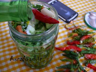 سبزی ها و صیفی جات رو مخلوط کنید و داخل شیشه پر کنید.