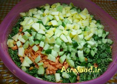 صیفی جات بشورید و اونها رو هم بگذارید خشک بشن بعد به اندازه دلخواه خرد کنید. معمولا حبه قندی یا ریزتر از اون خرد میشه.