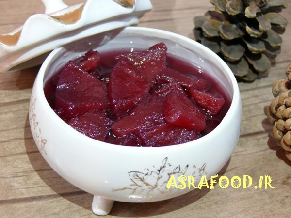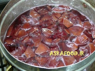 رنگ مربا رفته رفته قرمز میشه. حدود دو ساعت تا سه ساعت طول میکشه تا مربا آماده بشه.