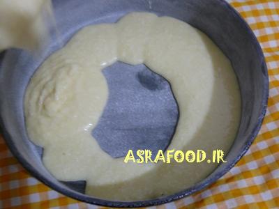 مایه رو داخل قالب بریزید، مایع رو از کناره ها بریزید تا وسط کیک گنبدی نشه، چون وقتی مایه رو از وسط قالب میریزید مقدار مایه وسط قالب زیاده در نتیجه وسط کیک زیادی پف میکنه.