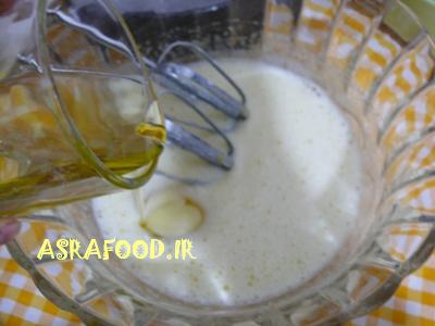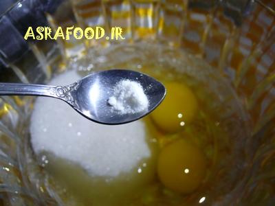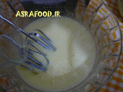 تخم مرغ و شکر و وانیل رو با هم زن بزنید تا شکر حل بشه و رنگ تخم مرغ کرمی بشه.