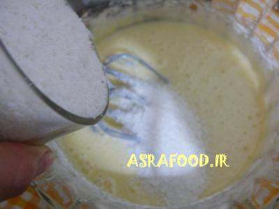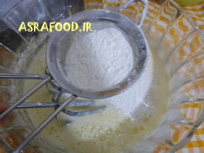 آرد رو مثل همیشه به همراه بکینگ پودر سه بار الک کنید، بعد داخل کیک هم در سه مرحله آرد رو الک کنید و هر بار چند دور با همزن بزنید تا مخلوط بشه، البته نباید زیاد هم زده بشه فقط در حدی که مخلوط بشه.
