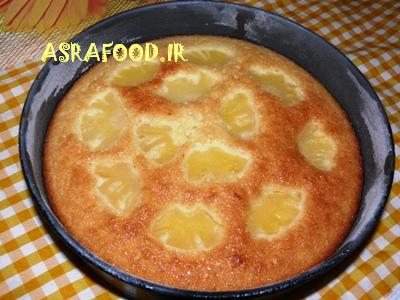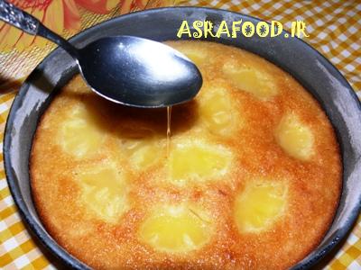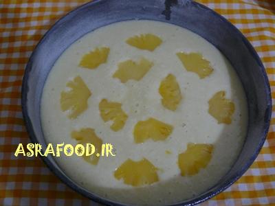 کمپوت آناناس رو به شکل درسته یا خرد شده روی کیک بچینید، من از کمپوت خرد شده استفاده کردم و از قطر هم برش دادم تا ورقه های آناناس نازکتر بشه، چون میترسیدم سنگینیش باعث فرو رفتن آناناسها داخل کیک بشه. میتونید مقدار بیشتر آناناس روی کیک بچینید.