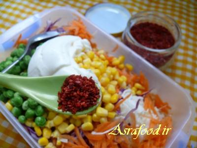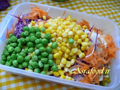 کنسرو ذرت رو هم داخل صافی بریزید تا آبش بره بعد داخل سالاد بریزید.