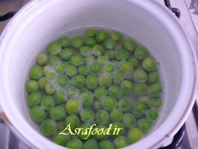 نخود فرنگی رو سه،چهار دقیقه در آب جوش پختم تا نرم بشه، بعد آبکش کردم.