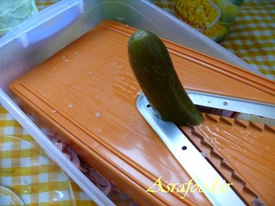 برای این سالاد معمولا مواد رو بشکل خلالی خرد میکنیم. برای اینکار من معمولا از رنده v یا همون رنده آلمانی استفاده میکنم.ژامبون من ورقه شده نبود، پس با همین رنده خلالیش کردم.به هر روش ژامبون رو خلالی کنید.