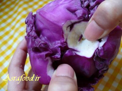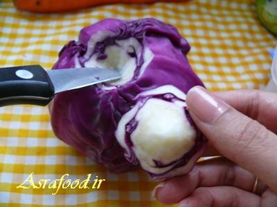 من سالاد رو داخل کلم سرو کردم، برای اینکار اول ته کلم رو مثل عکس به صورت مخروطی با چاقو در میاریم.