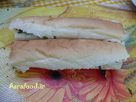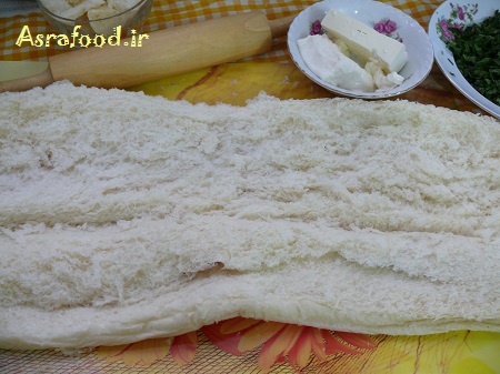 اگه از نان باگت استفاده می کنید، باگت رو باز کنید، با وردنه روش بکشید تا صاف بشه، میتونید مقداری از قسمت داخلی نان رو در بیارید بعد روش وردنه بکشید.