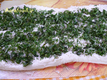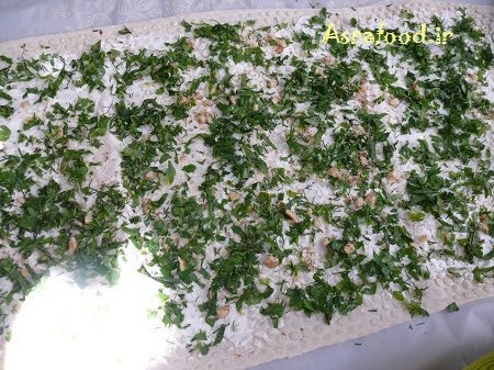 سبزی رو ریز خرد کنید، من معمولا از گشنیز، جعفری، ریحان، نعنا، شوید و کمی تره استفاده میکنم. روی نونها سبزی و گردو رو پخش کنید.مقدار نگفتم چون مقدارش رو میتونید بنا به ذائقه تون کمتر یا بیشتر کنید.